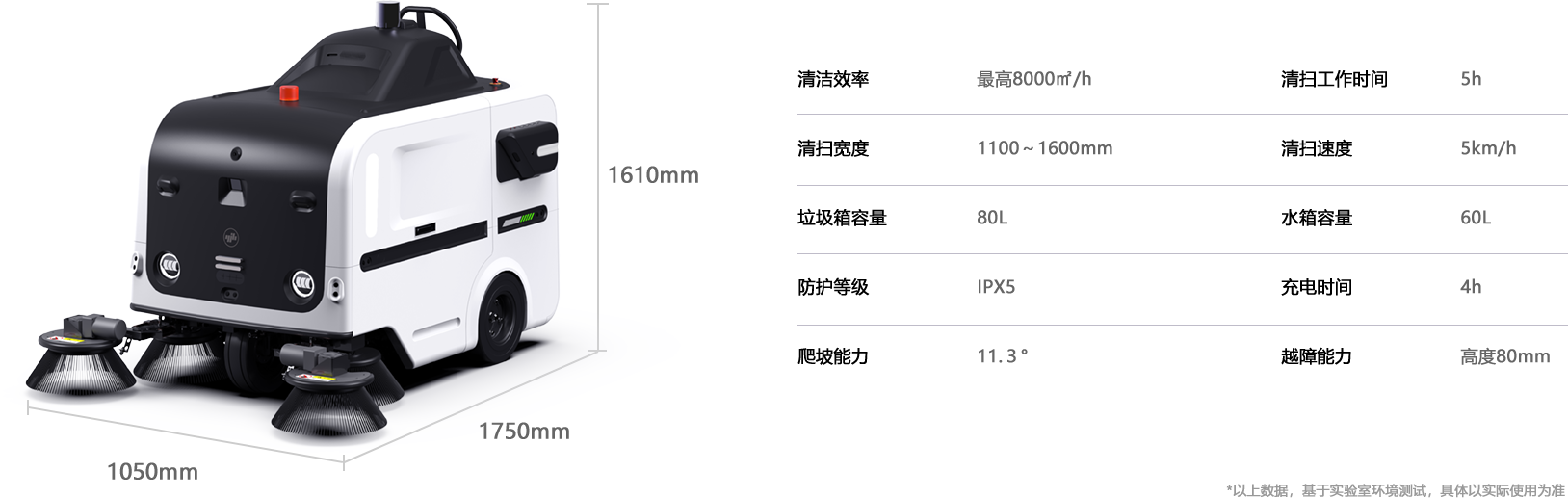 8cm底盘越障,11.3°平稳爬坡,1.2m窄道通行,3m掉头